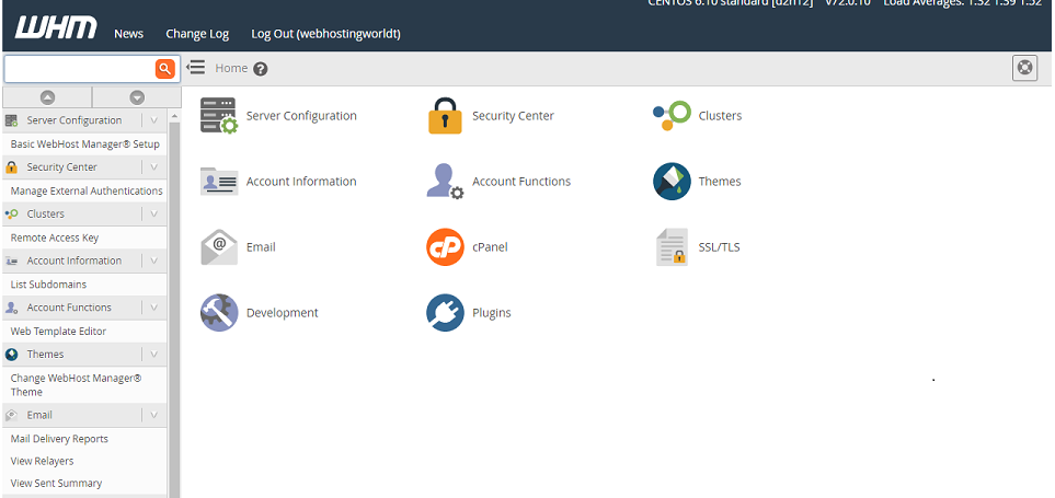 In the left column are all the options you have for managing your hosting service. They are divided into several sections and there is a Search field for quickly finding the option you need. The names of the sections are pretty much self-explanatory and we will cover the most important ones in our tutorials. The sections you will probably visit the most are Packages and Account Functions. This is where you can create, edit and remove hosting packages and accounts.